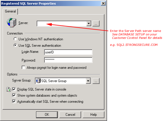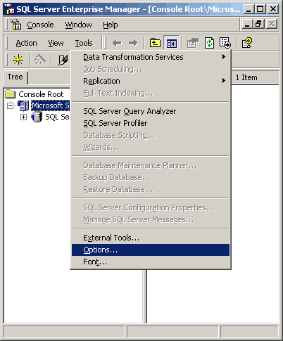 All SQL administration is performed via Microsoft's isqlw utility (SQL Server Query Analyzer). You must connect to our SQL Server via a TCP/IP sockets connection using TCP port 1433.